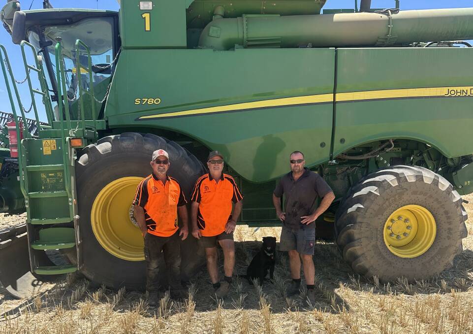 It’s been all hands on deck at the Reid’s property during harvest with Dennis Reid (left) and staff Craig Cox and Richard Daniels on to canola this week. Picture supplied