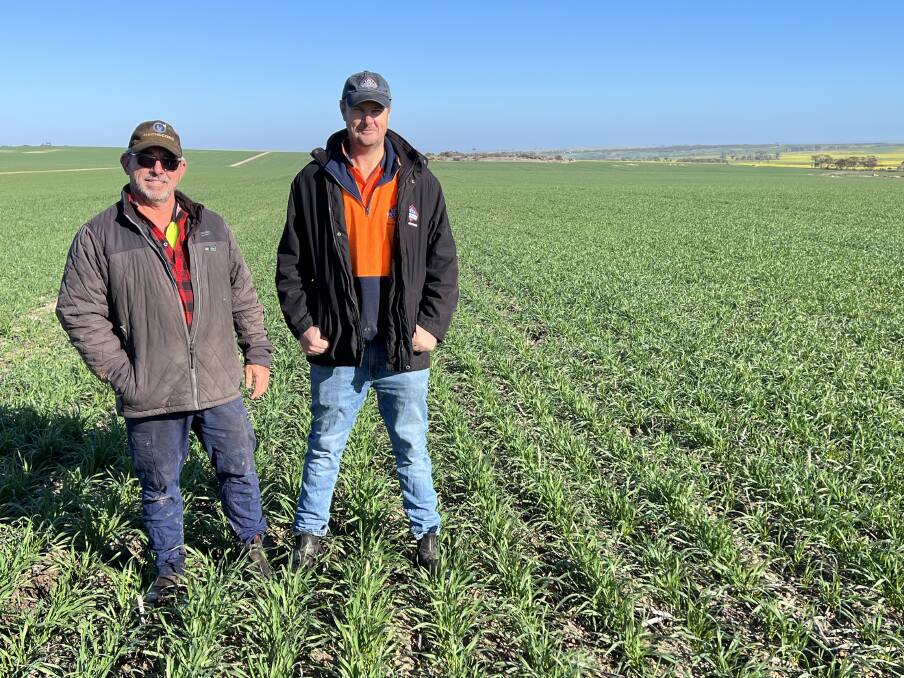 Kellerberrin farmer Dennis Reid (left) and Shane Starling, Eastern Districts Seed Cleaning Co, in Mr Reid’s 110-hectare paddock of new RGT Marsh at the start of this year.
